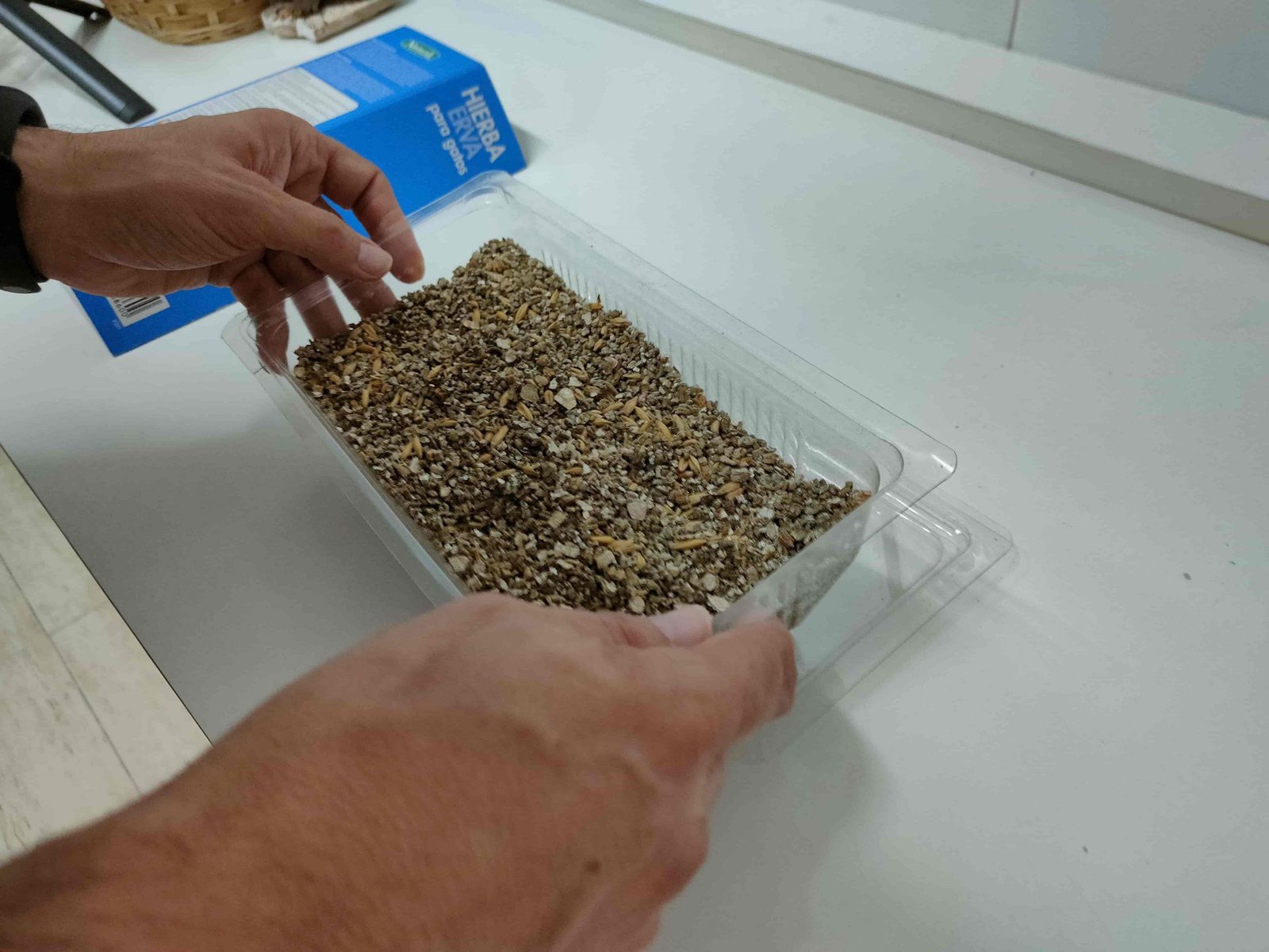 - Verter en la bandeja las semillas y mezclar con el sustrato mineral.