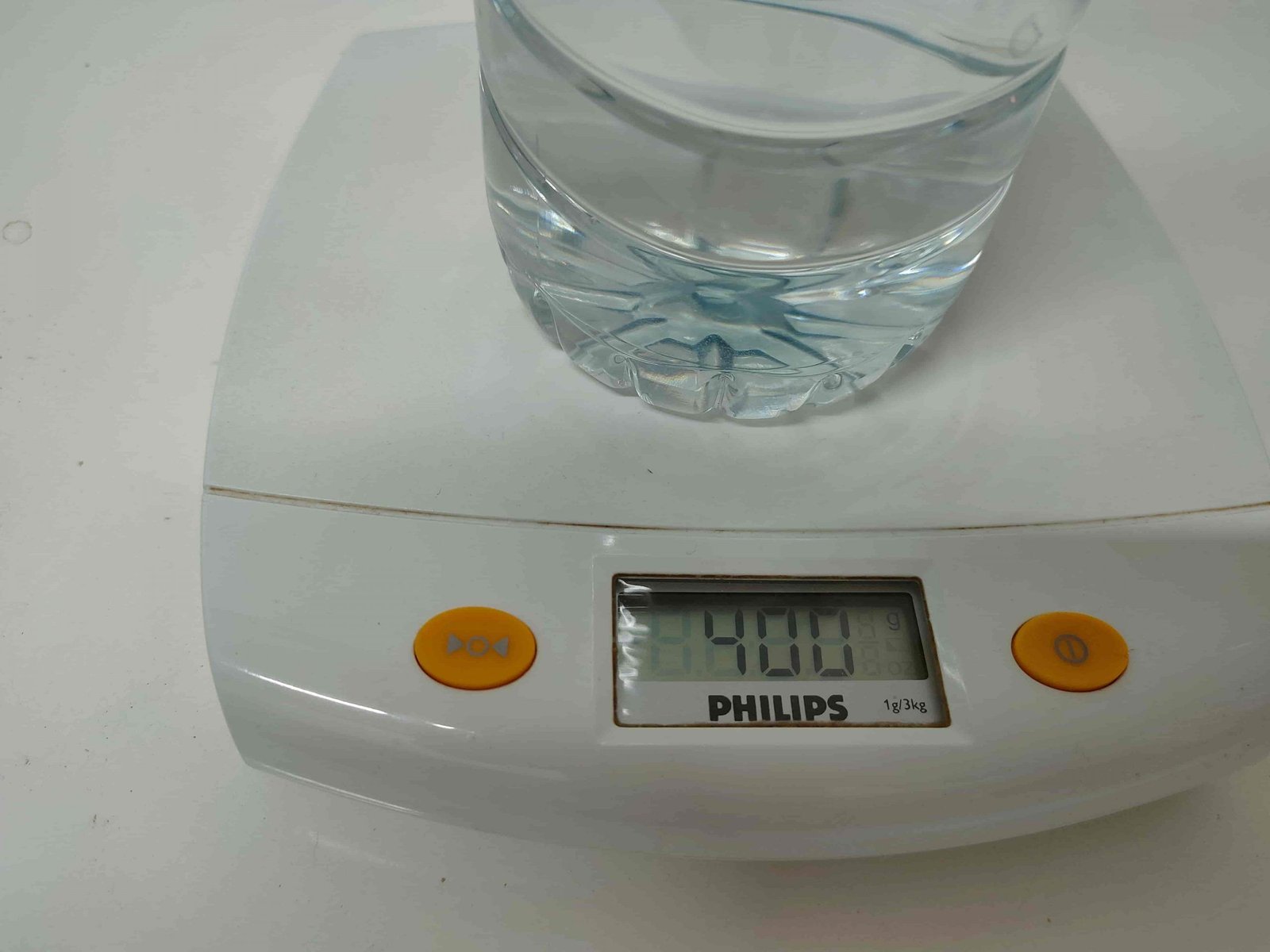 - Colocar la tapa debajo de la bandeja y verter 400 ml de agua. Nosotros no teníamos ningún medidos de agua y usamos la báscula. Al ser la densidad del agua 1, podemos pesar 400 mg para tener 400 ml de agua.